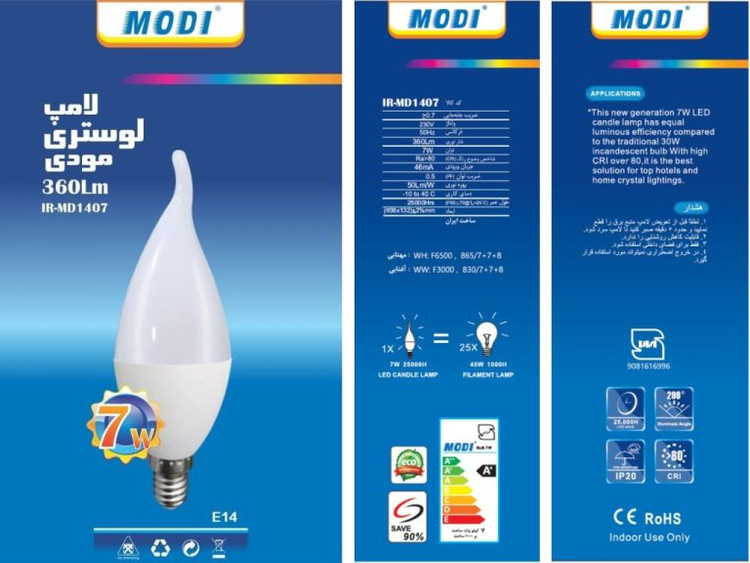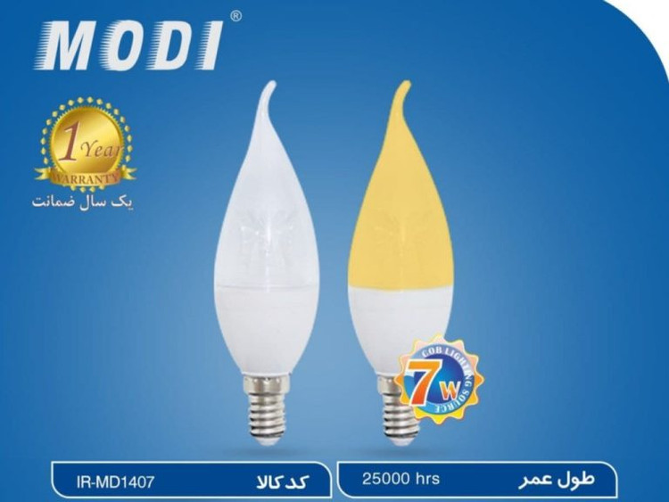 تکنولوژی لامپهای ال ای دی به کار رفته در ساخت این محصول موجب راندمان بالای آن شده است. این لامپ قادر است با توان مصرفی برابر 7 وات میزان نوری برابر 350 لومن از خود ساطع میکند. این نور خروجی معادل نور یک لامپ رشتهای 45 وات است. این ویژگی باعث قرار گرفتن این لامپ در ردهی انرژی A+ شده است. در ساخت این محصول جیوه به کار نرفته و نور آن فاقد اشعهی فرابنفش و فروسرخ است. زاویهی پخش نور لامپ فوق 200 درجه است و این میزان میتواند سطح زیادی را تحت پوشش قرار دهد. این لامپ طول عمری برابر 25000 ساعت دارد و سرپیچ آن از نوع E14 است. این محصول توسط شرکت «مودی» (MODI) تولید میشود و کیفیت ساخت قابل قبولی دارد.
