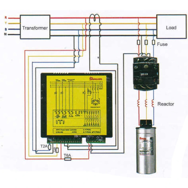 رگولاتور خازنی شریم جهت تعیین مقدار خازن در شبکه استفاده می شود که این تجهیز با اندازگیری جریان و ولتاژ خط می تواند مقدار خازن مورد نیاز شبکه را تعیین نموده و وارد مدار، یا از مدار خارج کند.