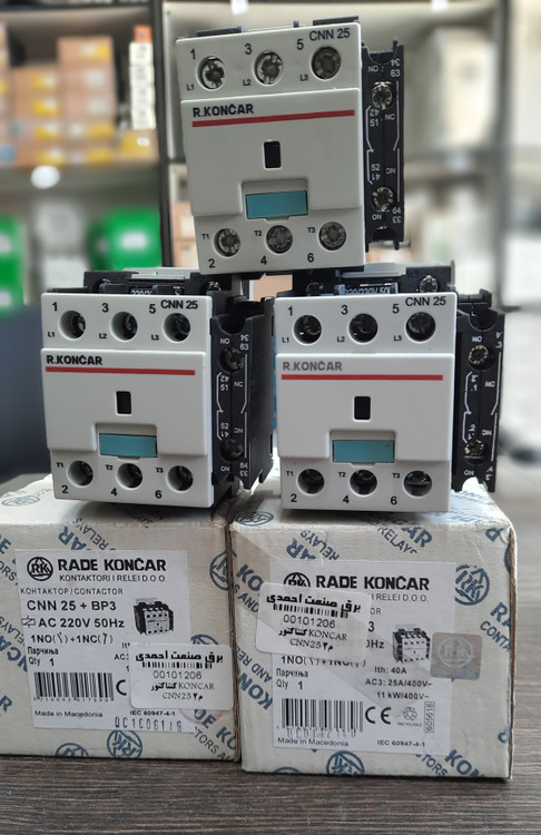 کنتاکتور، 25 آمپر، 11 کیلووات، 220 VAC ، برند RK اتحادیه اروپا CNN 25 11 شایان ذکر است که در مشخصات فنی زیر، جریان نامی و توان نامی براساس ولتاژ کاری 400VAC و شرایط بار AC3 ( یعنی جریان مجاز موتوری ) ارائه شده است.